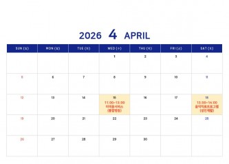 게시물 검색 검색 전체 12 건 사회복지팀 4월 안내 2026-04-04 사회복지팀 3월 안내 2026-02-27 사회복지팀 2월 안내 2026-01-30 사회복지팀 1월 안내 2025-12-29 사회복지팀 12월 안내 2025-11-28 사회복지팀 11월 행사 2025-10-29 사회복지팀 10월 행사 2025-10-20 사회복지팀 9월 행사 2025-08-26 사회복지팀 8월 행사 2025-07-31 사회복지팀 7월 행사 2025-06-30 사회복지팀 6월 행사 2025-05-27 사회복지팀 5월 행사 2025-05-08